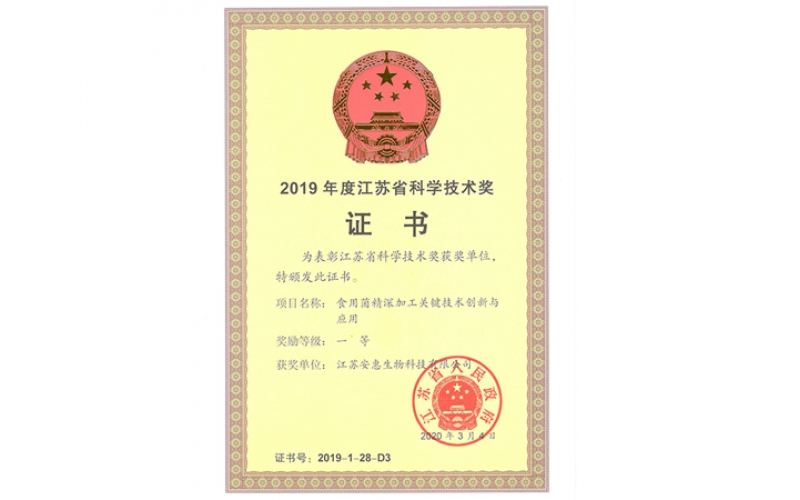 2020年3月,由江蘇安惠生物科技有限公司參與南京財經(jīng)大學(xué)、南京農(nóng)業(yè)大學(xué)、中國農(nóng)業(yè)大學(xué)等科研院所承擔(dān)的食用菌精深加工關(guān)鍵技術(shù)創(chuàng)新與應(yīng)用榮獲江蘇省科學(xué)技術(shù)獎一等獎。