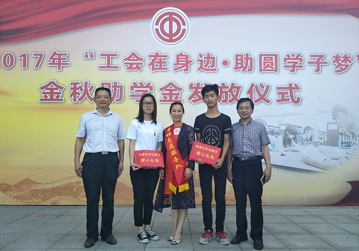2017年8月24日上午,南通市總工會組織召開“工會在身邊 助圓學(xué)子夢”金秋助學(xué)活動。安惠公司副董事長陸漢萍出席活動。她心系寒門學(xué)子,積極響應(yīng)并加入到勞模志愿服務(wù)隊(duì)伍當(dāng)中,通過安惠愛心基金定向捐助張沙宇、秦玉婷兩位困難職工的子女,圓了他們的上學(xué)夢。她勉勵(lì)兩位學(xué)子努力學(xué)習(xí),學(xué)有所有成,回報(bào)社會;同時(shí)也承諾,安惠人將一如既往地關(guān)注、幫助到他們的成長。